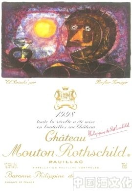 1998—墨西哥画家鲁菲诺·塔马约(Rufino Tamayo)曾在1990年答应为木桐创作一幅酒标,但不幸地他在1991年就去世了。然而,他的家庭希望完成这个他未完的心愿,于是在他的画作中选出了一幅用作1998年的酒标。画作描写的是在淡红色的阳光下,一个握着酒杯的男人干杯的场景,这是墨西哥普遍的一种宗教仪式。画面寓意在蛮荒时代,人们就已被葡萄酒这人生之乐所征服。