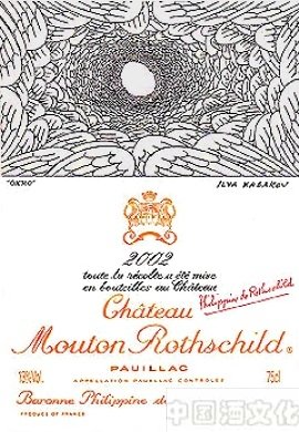 2002—卡巴可夫(ILYA KABAKOV)莫斯科观念艺术家,他在当时是颇有影响力的人物。他艺术生涯开始于70年代,到80年代时他的装置艺术在西欧已经很有名气了。其中最有名的装置艺术《洗手间》还受邀参加了德国第9届卡塞尔文献展。《洗手间》展示了他当时在俄国各地的洗手间里收集的物品,这些物品在一个搭建的毗邻的男女卫生间内展示,这间卫生间被故意安排成起居室和卧室的格局,这样的格局是当时苏联两人间公寓的典型户型。他用冷嘲热讽的艺术手法让观众了解到苏联的公有体制逐渐让位给私有制的事实。在为木桐创作的2002年酒标中,他表达了自己对于用透视手法将图形和多维空间结合在一起的偏爱,他将这幅画命名为OKHO(俄语:窗户),在空间的尽头,艺术家向我们展示了另一个世界:无尽的旋转,无数的翅膀轮廓将人们带领到酒瓶深处的梦幻天堂。