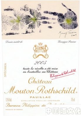2005—著名雕塑家吉赛帕·帕诺内(Giuseppe Penone)。这位意大利的艺术家1947年降生在著名酒乡皮尔蒙特省的Garessio小城。年轻时,帕诺内曾求学于都灵,在此期间,他成为了意大利“贫困艺术”运动的领导者之一。2004年,帕诺内在巴黎的蓬皮杜中心举办了他的个人作品回顾展。在帕诺内的艺术生涯中,他一直在寻求植物世界与人体的联系,他认为这个联系将会揭示出两者之间物质的实质性。在他给木桐酒庄绘制的2005年份酒标图中,他试图想将种植者手指所散发的生命力,通过葡萄叶延伸到饮者的手中。