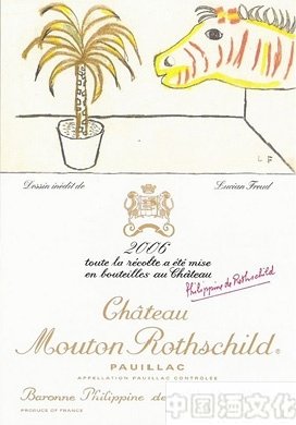 2006—86岁高龄英国著名艺术家Lucian Freud是心理学家西格蒙德·弗洛伊德的孙子,被公认英国最伟大的当代画家,其作品在伦敦佳士得与苏富比拍卖会上的拍卖价格位居当代艺术家榜首。木桐酒庄委托为其设计酒标已有六十年,他此次为其设计的酒标上,画着酒庄传统的公羊标志,红色条纹的斑马和一棵盆栽树。