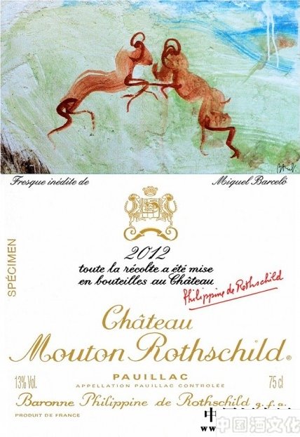 2012年份木桐酒庄酒标的设计灵感来自于木桐酒庄的家徽——两只公羊。酒标设计师,西班牙人——Miquel Barcelo生于1957年。他的作品于1996年在巴黎现代艺术博物馆展出,其水彩作品再次于2004年在卢浮宫展出。在过去二十年里这位艺术家名声大噪。