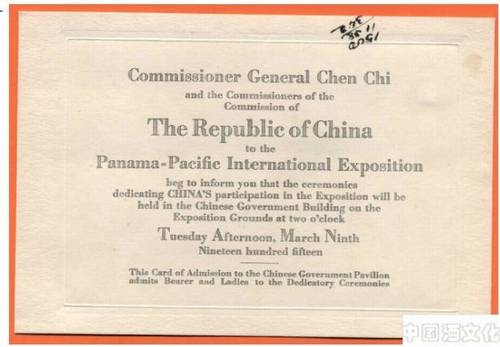 时任农商部长的陈琪,以中国代表团团长和巴拿马赛会事务局局长的身份,颁发了这个邀请卡。上面说“邀请您于1915年3月9日星期二的下午2点在中国政府馆,莅临中国参加博览会的纪念活动”。
