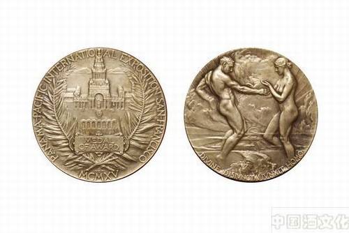 正面反映了博览会的中心建筑———宝石大厦的景色,四周是博览会的全称字样。奖牌( M E D A L O F A W A R D)字样刻在建筑物下面一个旋涡装饰的方块里,左右两边是两枝好看、优雅的棕榈树枝叶。由此衬托出博览会的象征、主题和中心位置。宝石大厦的背后是旧金山湾的海面,远处隐约可见名城的起伏山峦。一幅画面赋予奖牌丰富的地域和现场内涵,使人们感觉回到了90年前的昨天,重复当初展览、得奖、发奖的隆重场面,回忆当初得到的崇高荣誉。