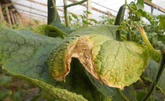 该病引起的黄瓜烂头症状:病菌侵染时从新叶边缘入侵,引起叶片边缘干枯,叶脉弯曲褶皱,叶片卷曲。