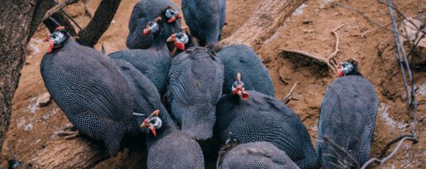 珍珠鸡外观与雌孔雀相似,头问很小,面部呈淡青紫色,喙强而尖,喙尖端呈淡黄色,后部红色,在喙的后下方左右各有一个心状肉垂。