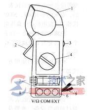 1-钳头2-钳头扳机3-保持开关4-旋转开关5-显示器6-绝缘测试附件接口7-公共地端8-电压电阻输入端9-手提带