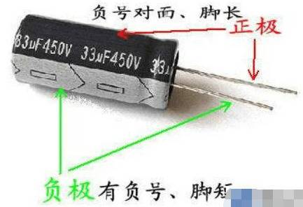 有极性电解电容长脚为正极,短脚为负极。贴片式无针脚的,可以看“负号-”标识。
