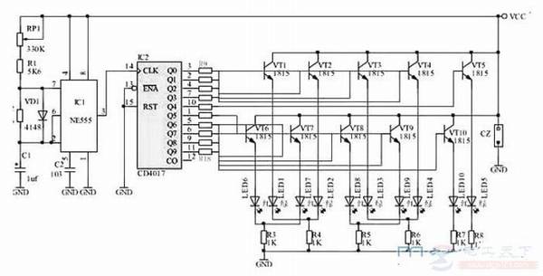 由NE555时钟脉冲发生电路、CD4017十进制计数器/分配器电路、三极管驱动电路以及双色发光二极管组成。