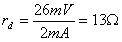 ID为静态电流,常温下UT=26mV。从式(3)可知,静态电流ID越大,rd将越小。设UD=0.7V时,ID=2mA。由此可得直流电阻RD=350 而按式(3)可得动态电阻(交流电阻)