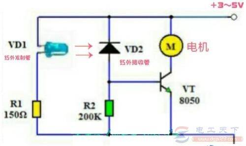 VD2为红外接收管,这种管子只要接收到红外信号,其反向电阻就会显著变小(与光敏电阻相似)。当VD1和VD2之间没有遮挡物时,VD1发出的红外线被VD2接收,故VD2的反向电阻很小,三极管VT饱和导通,其集电极控制的马达得电工作。当有物体从VD1和VD2之间经过时,VD1发出的红外线信号被遮挡,致使VD2无法接收到红外线信号,此时VD2的反向电阻变得很大(可达MΩ级),VT截止,马达断电停止工作。