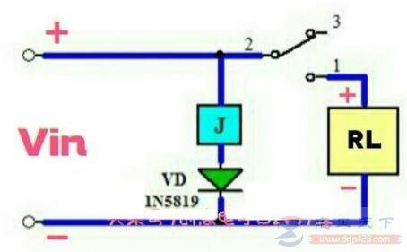 如果Vin的正负极接错,此时二极管VD截止,继电器J不工作,其常开触点断开,RL两端无电压也不工作,从而保护负载RL不会因电源极性接反而损坏。
