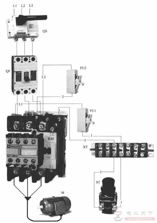 2、启动运转按下启动按钮ST,其动合融点闭合,电源L1相->控制回路熔断器FU1->1号线一启动 ,按钮ST动合触点(按下时闭合)->3号线-接触器KM线園->2号线->控制回路熔断器 FU2->L3相,接触器KM线圈两端构成380V的工作电压。