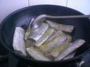 3.油开至9成热的时候,放入刀鱼,一定要用大火呀,这样刀鱼不能粘锅,要两边来回翻转,直至两面到金黄色,