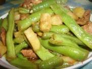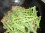 将豆角放锅中炒几分钟,使豆角边成翠绿色。
