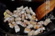 4.烧热滑油,将五花肉块及生姜片下锅中小火煸炒,煸至肉块出油表皮微微焦香金黄时出锅;