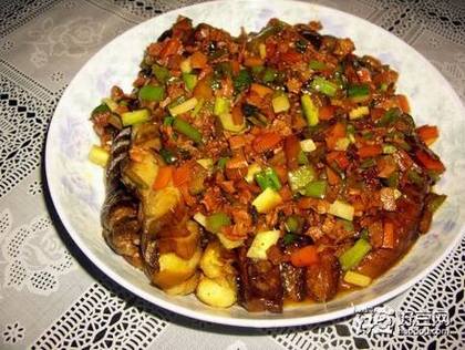 17.先把茄子盛入盘中,在汤汁浇在上面即可