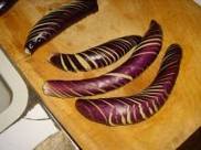 1.先将茄子洗净,从一头斜切成薄片(不要切透)翻过来再斜切,使中间相连而不断