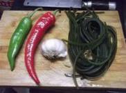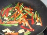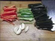 3.浸泡后洗净切段,青红椒也切同样长短的丝。蒜头拍碎