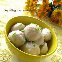 3把煮过的芋艿放入冷水中冷却后剥去皮,个头较大的芋艿可以切开成块,把葱切成葱花备用。