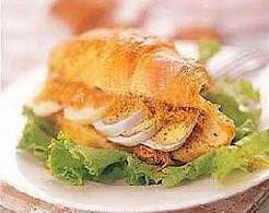主料:牛角面包,本来不是三明治常用的面包材料,但它独特的外形,微咸的味道,绝对适合发挥你的创意。,辅料:肉松,鸡蛋,沙拉酱。