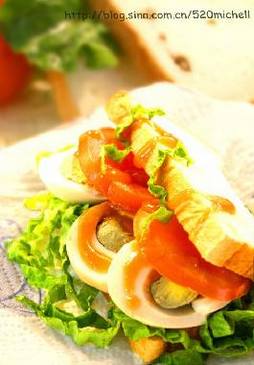 6.将土司对折,铺上生菜丝,再放上鸡蛋片,随后夹进番茄片,淋上番茄酱或沙拉酱即可。