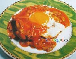 鸡蛋一个、面包片1片、圆葱碎5g、西芹5g、口蘑碎10g、番茄沙司10g。调料盐0.4g、胡椒粉0.1g、橄榄油l 5g。制法煎盘中倒入橄榄油,烧热后把鸡蛋煎成鸡蛋饼备用,另取煎盘放橄榄油烧热,放面包片炸成金黄色捞出放入盘中,上面放煎好的鸡蛋饼。煎盘放橄榄油烧热,下圆葱碎、西芹碎炒出香味,加入口蘑碎、番茄沙司、盐、胡椒粉、调成汁,浇在蛋饼上即可。厨艺经验