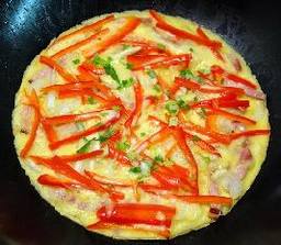 4、蛋糊底层稍微凝固时,铺上培根丝、红椒丝、洋葱丝,最后铺奶酪丝。