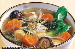 鸡胸脯肉100g,鲜海带结10g,鲜贝2只,小油菜2棵,胡萝卜30g,鲜香菇2朵