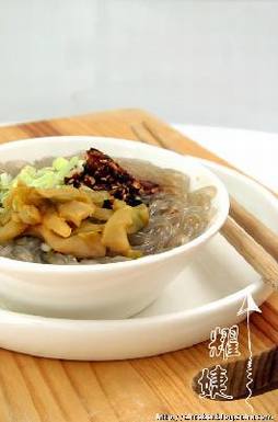 5.把粉放在装好料汁的碗中,倒入煮红薯粉的汤,表面再放上油辣椒、葱花、香菜和榨菜。