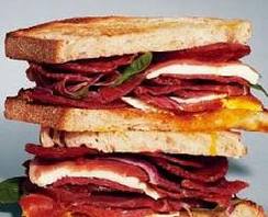 用低温烧热平底锅,油煎萨拉米香肠到散发出淡淡的脆香,油脂彻底溢出,每面大约煎两分钟,然后挪到锅的一边。接着,用同一个锅煎鸡蛋的一面,然后挪到锅的一边。在一片面包上,夹上萨拉米香肠、熏火腿片、干酪、浸泡过的红洋葱片,然后用另一片面包合上。然后把面包放入同一个锅里,用手掌压住三明治,然后轻轻地翻转,烤面包的另一面。把面包挪到锅边,打开三明治,在面包的下半部分放上鸡蛋、罗勒叶。合上面包,切成对角线,然后就可以尽情享用了。