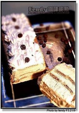 5.把冷冻好的咖啡奶油浆倒入铺满威化的容器里,再铺上一层威化,并在威化上蘸上咖啡。