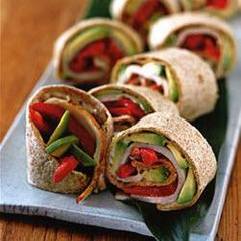 1.在小碗中拌匀美乃滋和芥末酱。墨西哥卷饼放在砧板上,将拌好的美乃滋酱均匀地涂抹在卷饼上。 卷饼上铺放酪梨,饼边四周空出1.3厘米。再依次放上火鸡肉和甜椒。2.将卷饼卷紧放在砧板上,开口压在下面,用锯齿刀将两边切齐,再将每个卷饼切成6份。开口向下,装盘上桌。