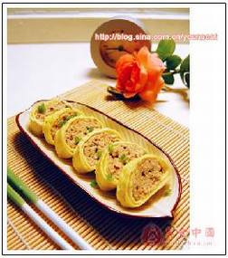 4、在每张蛋饼中放入肉馅,卷起,用面糊封口。