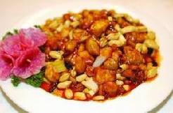 主料:嫩仔鸡脯肉250。,调料:花生米,白糖,醋,酱油,味精,肉汤,湿淀粉,花椒,姜,蒜,葱末,盐,酱油,料酒。