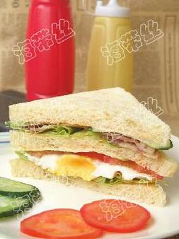 土司3片,黄瓜4-6片,番茄4片,鸡蛋1个,培根2-4片,沙拉酱适量,生菜适适量