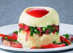 取1个小饭碗,将番茄片放在碗底,底部向下,再放入1/2份的土豆泥,接着放入做好的番茄沙拉,再将余下的土豆泥填入碗中,并充分压实。