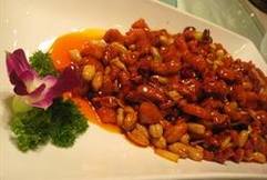 (3)起油锅,放少许油,放入蒜末及干辣椒段爆香后,再加入过油后的鸡肉丁及宫保酱,拌炒至酱汁收干后,再放入蒜味花生略炒均匀,即可盛起放入盘中。
