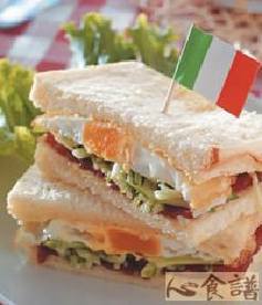 5.取作法1的一片土司,抹上美乃滋,依序放上作法3的火腿片、作法4的小黄瓜丝和作法2的荷包蛋,再放上另一片抹了美乃兹的土司,对切成二等份摆盘即可。