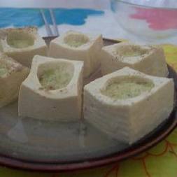 把豆腐切小方块,用小勺挖洞,挖出来的部分可以做凉拌豆腐,别扔掉哦。