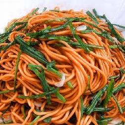4、把香肠丝、葱丝和虾皮放在煮好的面条上,再放入适量的酱油、精盐、味精和麻油拌匀(就可以吃了)