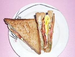 (2)三片面包分两层,第一层放鸡蛋,西红柿片,喜欢的话可以抹上些沙拉酱,第二层放土豆泥和火腿片,如果不喜欢土豆泥的话可以加一些黄瓜片.