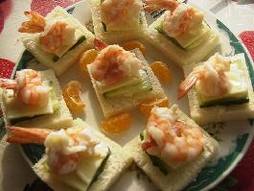 1.把虾皮剥掉,留虾尾巴,然后用小刀在虾身上穿过,(可怜的虾)挑去泥肠,把尾巴从伤口穿出去,成为松鼠状。下锅烫熟,沥干。2.面包片切掉边,一分为四。黄瓜切成图上的样子,奶酪片一分为九。