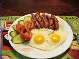 1.起一平底锅,下少许油.2.先煎热狗肠,快好时将热狗肠拨到锅边保温后,下二个蛋,蛋白成型变白后摆下西红柿煎出汁后,就下点水盖锅盖,这样蛋才会漂亮.熟了但又不老.(哈!同理适用女人).