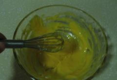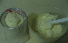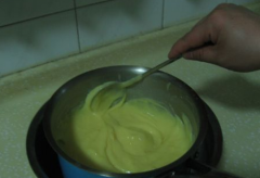 10、马上把煮好的蛋乳泥放入冰水里,并不停地搅拌,使蛋乳泥保持细腻光滑的状态,不结块,不起疙瘩。