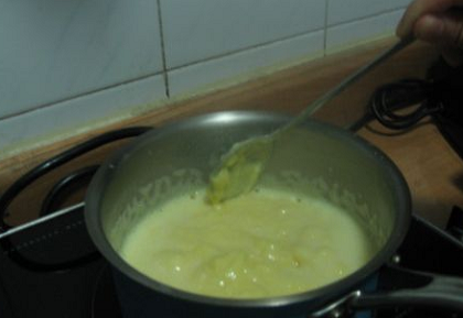 9、奶锅重新小火加热,边加热边不停地搅拌,直到面糊沸腾。变浓稠后,立即离火