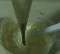 13、香草奶油馅准备裱花嘴,裱花袋,广口瓶子,将奶油馅装入裱花袋内。